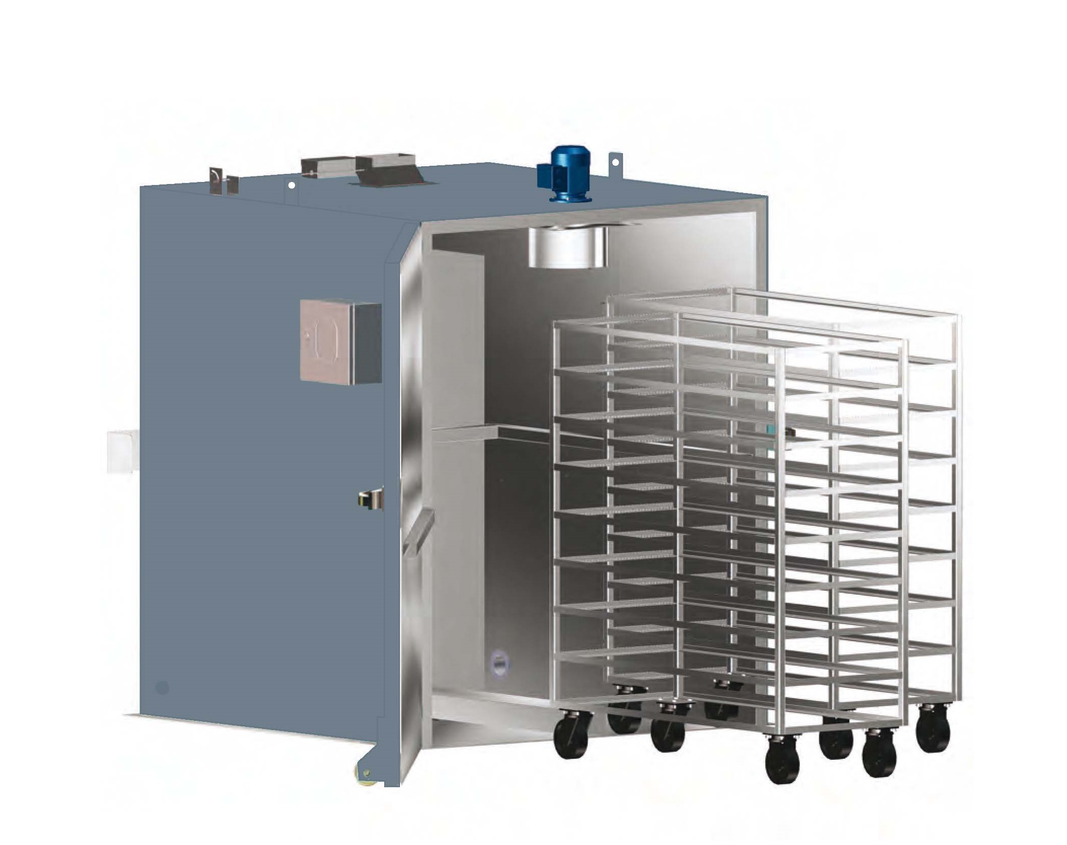 - Передвижные вагонетки с решетчатыми полками позволяют удобно размещать образцы для сушки.